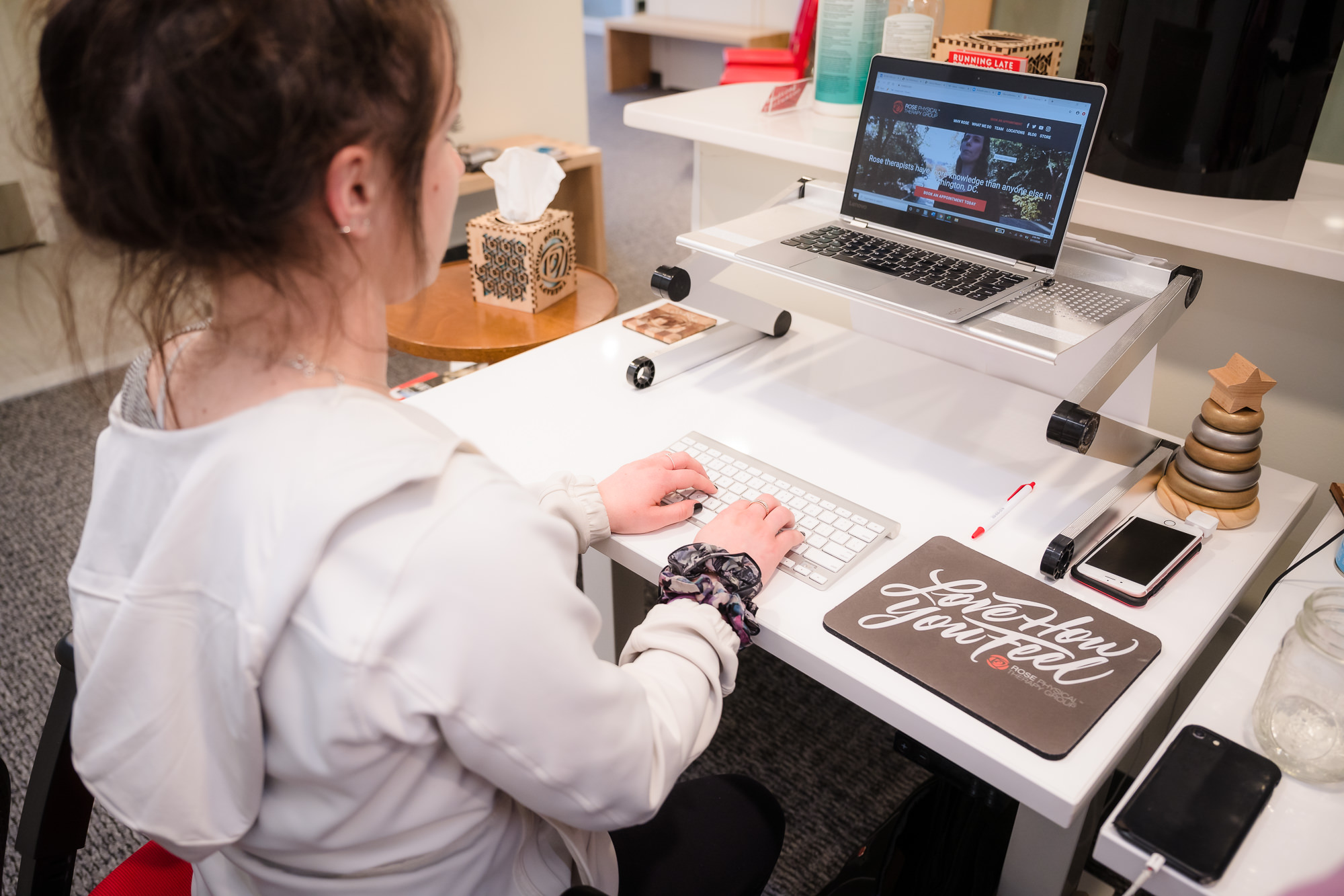 In Washington, DC where we love to work hard, having the right work station ergonomics is essential to our quality of life. It is important to maintain good posture while at your desk including utilizing the addition of an external keyboard, computer riser, and a lumbar support.